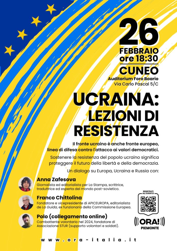 Giovedì 26 febbraio alle 18.30 presso l’Auditorium Foro Boario di Cuneo (via Carlo Pascal, 5C), Franco Chittolina sarà relatore dell’incontro “Ucraina, lezioni di resistenza”, promosso da ORA! Piemonte.