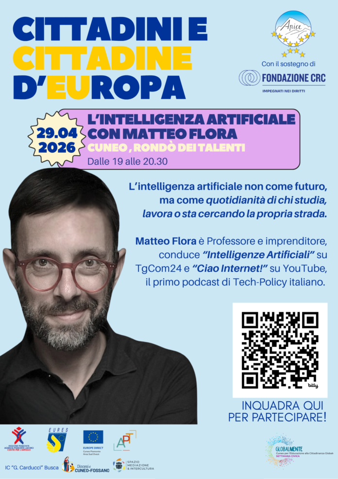 Mercoledì 29 aprile alle 19.00 presso il Rondò dei Talenti (via Luigi Gallo, 1, Cuneo) si terrà l’ultimo appuntamento del secondo modulo di “Cittadini e cittadine d’Europa”: lo stesso sarà un seminario informativo sul ruolo dell’intelligenza artificiale non come futuro, ma come quotidianità di chi studia, lavora o sta cercando la propria strada. L’IA, infatti, può diventare una leva potentissima di crescita personale e professionale, ma a una condizione: imparare a usarla con consapevolezza. Relatore dell’evento sarà Matteo Flora, Professore (a.c.) in Sicurezza delle AI e delle Superintelligenze (ESE), Corporate Reputation (Pavia) e Generative AI (IAAD), Imprenditore, ha fondato The Fool, società leader in Narrative Governance oltre a essere Partner e co-fondatore dello Studio Legale 42 Law Firm. Future Leader IVLP del Dipartimento di Stato USA (Obama, 2012), conduce “Intelligenze Artificiali” su TgCom24 e “Ciao Internet!” su YouTube, il primo podcast di Tech-Policy italiano.
