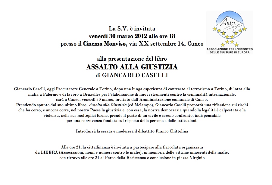 Apice vi invita a partecipare all’incontro con GIANCARLO CASELLI, Procuratore Generale a Torino,  che presenterà il suo ultimo libro “Assalto alla giustizia”, venerdì 30 marzo 2012 alle ore 18, presso il Cinema Monviso, via XX settembre 14, Cuneo.