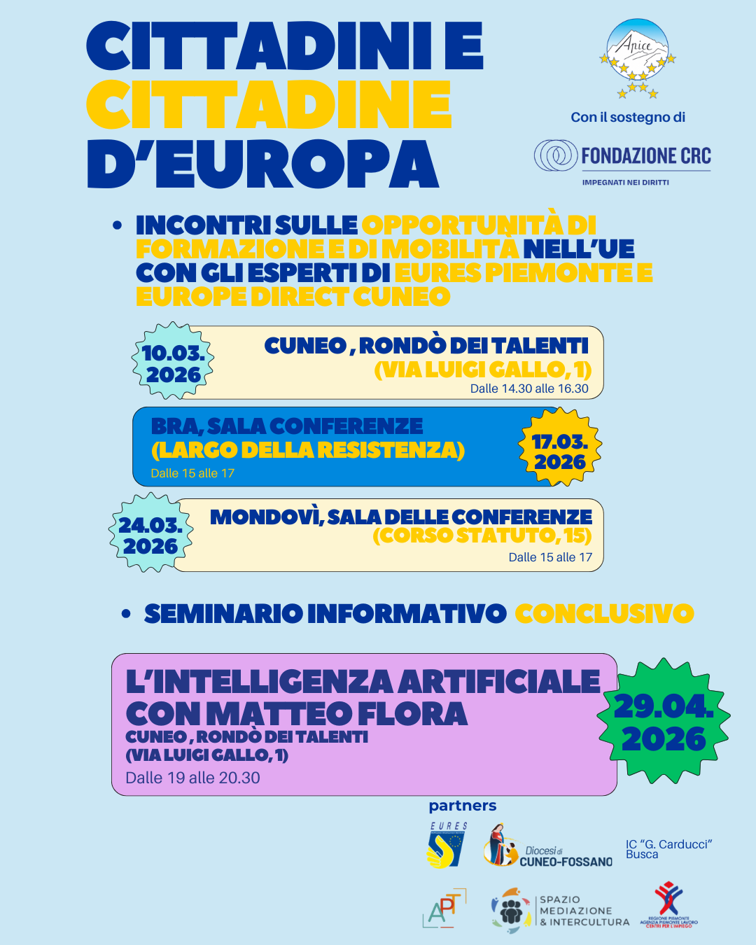 Per questo motivo, l’associazione Apiceuropa promuove eventi e iniziative volte ad approfondire le opportunità di mobilità e formazione disponibili nell’Unione Europea e a conoscere meglio l’Intelligenza Artificiale, all’interno del progetto “CITTADINI E CITTADINE D’EUROPA”, realizzato con il sostegno della Fondazione CRC nell’ambito del bando “Impegnati nei diritti 2025” e il partenariato di numerosi enti ed associazioni del territorio.