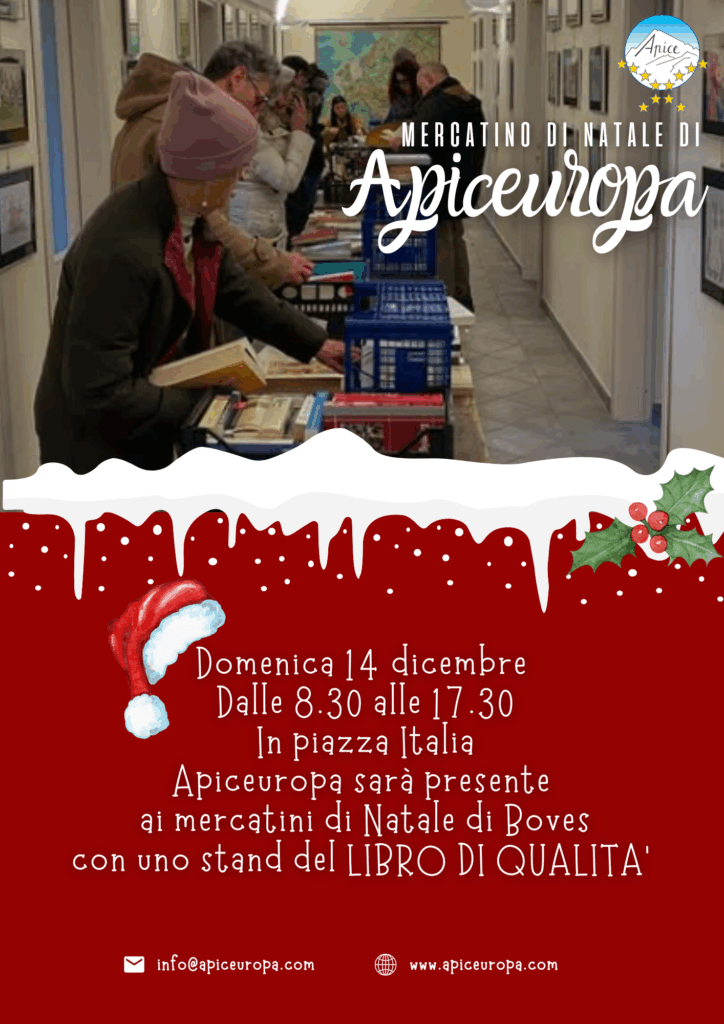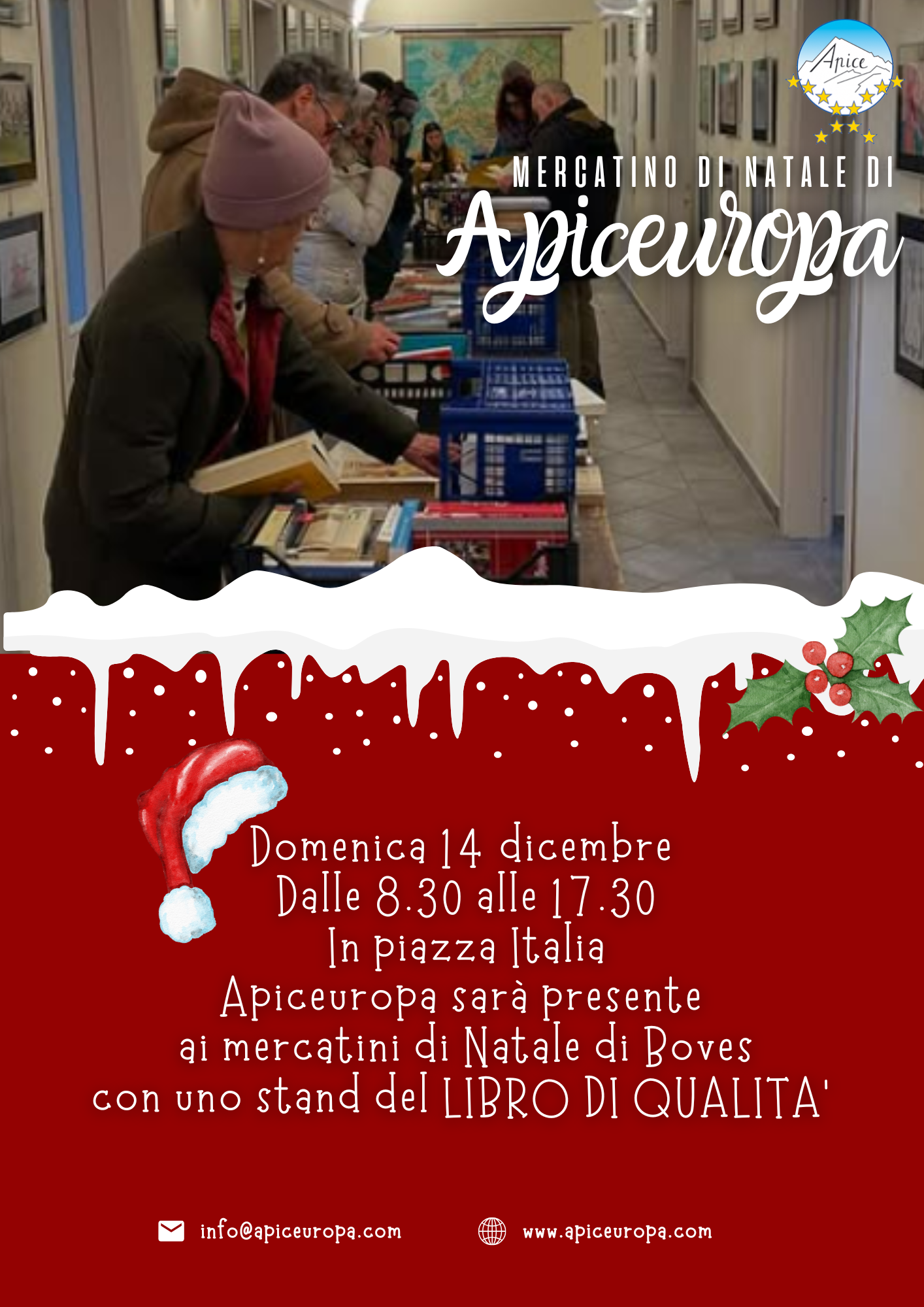Domenica 14 dicembre 2025, in piazza Italia (Boves), l’Associazione Per L’Incontro delle Culture In Europa (Apiceuropa), parteciperà ai mercatini di Natale del paese con uno stand dedicato al libro di qualità: un piccolo mercatino di libri nuovi ed usati, con volumi che, attraverso la narrativa e l’arte esplorano e raccontano l’Europa.
