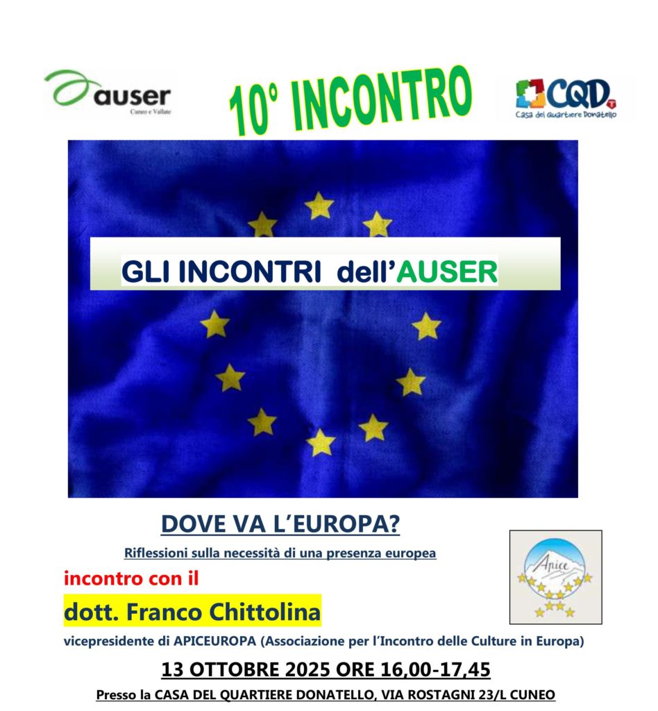 Lunedì 13 ottobre alle ore 16.00 presso la Casa del Quartiere Donatello in Via Rostagni 23/L a Cuneo, Auser propone l’incontro: “Dove va l’europa? Riflessioni sulla necessità di una presenza europea”, che vedrà come relatore Franco Chittolina.