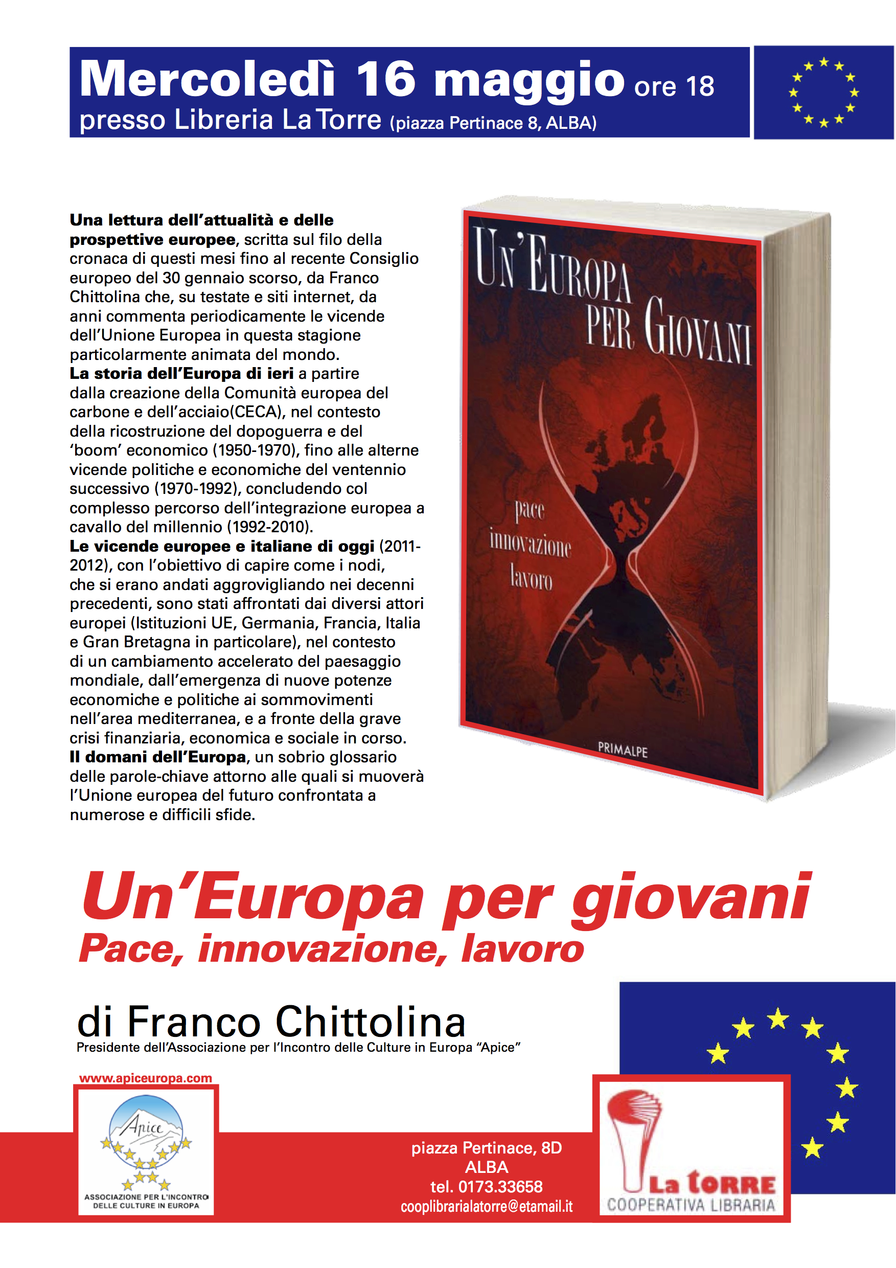 Si terrà mercoledì 16 alle ore 18 la presentazione del libro “Un’Europa per Giovani. Pace, innovazione, lavoro”.